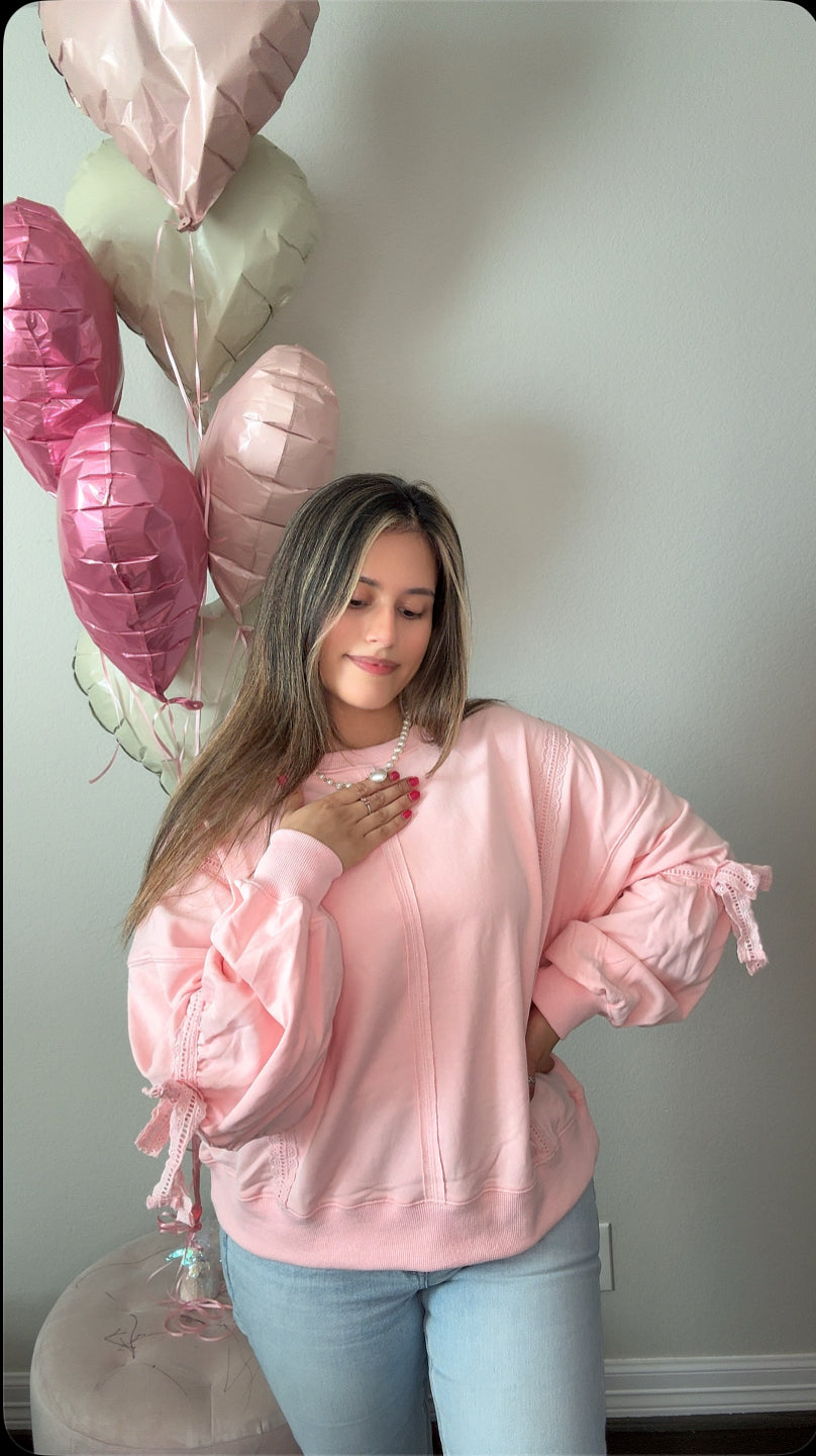 The signature bow accent adds a touch of sophistication to an otherwise relaxed silhouette, making it versatile enough for layering or wearing solo. Crafted in a soft light pink hue, this piece transitions seamlessly from weekend errands to cozy evenings.